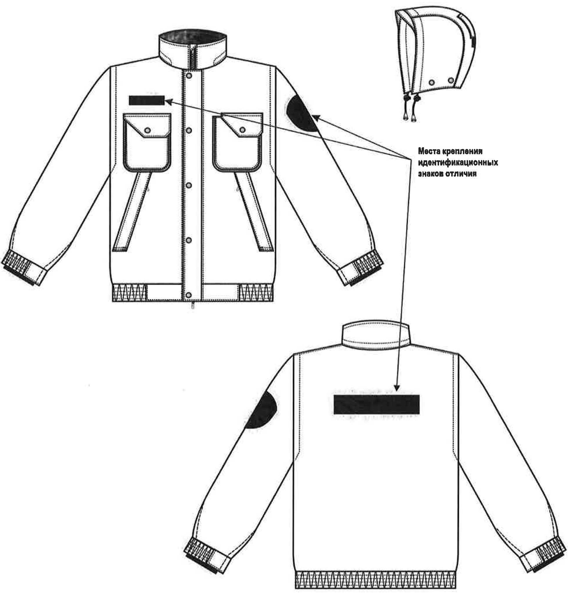 Капюшон без утеплителя, с подкладкой из основной ткани, с притачным козырьком. По лицевому вырезу регулируется внутренней кулисой с эластичным шнуром со свободными концами с фиксаторами и концевиками, на затылочной части - хлястиком с контактной лентой, пристегивается к воротнику на кнопки.