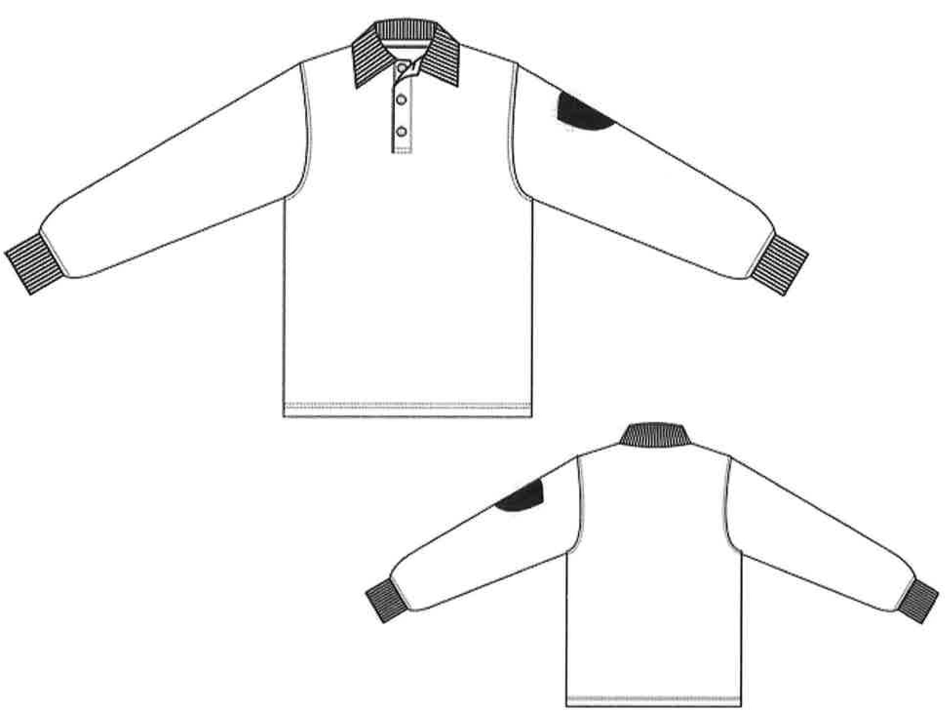 2.5. Футболка "поло" с длинным рукавом (рисунок 23), с отложным воротником, прямого силуэта, застегивающаяся на три обметанные петли и три пуговицы; верхняя петля расположена горизонтально, остальные - вертикально. Низ планки закреплен отделочной строчкой шириной 0,5-0,7 см. Рукава длинные, втачные с вязаными манжетами. Шов втачивания воротника обработан бейкой. Ширина бейки 0,8-1,0 см. Низ изделия обметан и закреплен двумя параллельными строчками. Ширина подгибки 2,0 см. Швы втачивания рукава и манжета закреплены отделочными строчками шириной 0,5-0,6 см. В левом боковом шве расположена маркировка. На левом рукаве расположен нарукавный знак (шеврон).