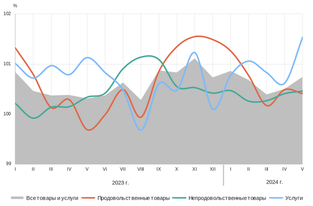 | непродовольственные товары | 100,46 | 101,88 | 107,14 | 106,74 | 100,34 | 100,76 | 100,16 | 104,37 |