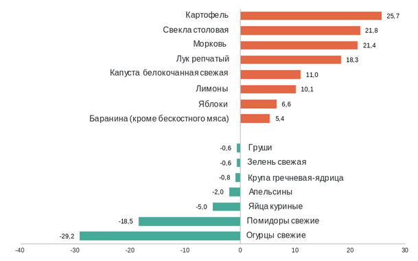 В мае изменились цены на отдельные виды плодоовощной продукции: на свеклу столовую +21,8%, морковь +21,4%, лук репчатый +18,3%, капусту белокочанную +11,0%, лимоны +10,1%, яблоки +6,6%. Снизились цены: на огурцы (-29,2%), помидоры (-18,5%), апельсины (-2,0%).