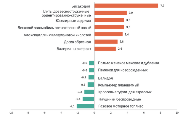 На лекарственные препараты, относящиеся к ЖНВЛП, цены в среднем изменились на +0,9%, в том числе на бисакодил +7,7%, амоксициллин с клавулановой кислотой +3,4%, парацетамол +2,5%, дротаверин (но-шпу) +1,4%, эналаприл +1,3%, глицин, ингавирин, перекись водорода, фуросемид и эуфиллин +1,1%, омепразол +1,0%. Снизились цены: на супрастин (-0,5%), ибупрофен (-0,3%), амлодипин, осельтамивир (номидес) (-0,2%).