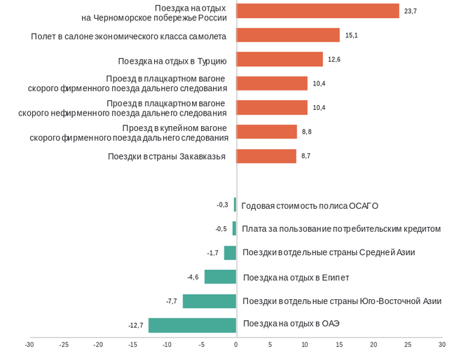 Среди услуг зарубежного туризма изменились цены: на поездки на отдых в Турцию +12,6%, страны Закавказья +8,7%, Беларусь +4,0%. Снизились цены на поездки в ОАЭ (-12,7%), отдельные страны Юго-Восточной (-7,7%) и Средней (-1,7%) Азии, Египет (-4,6%).