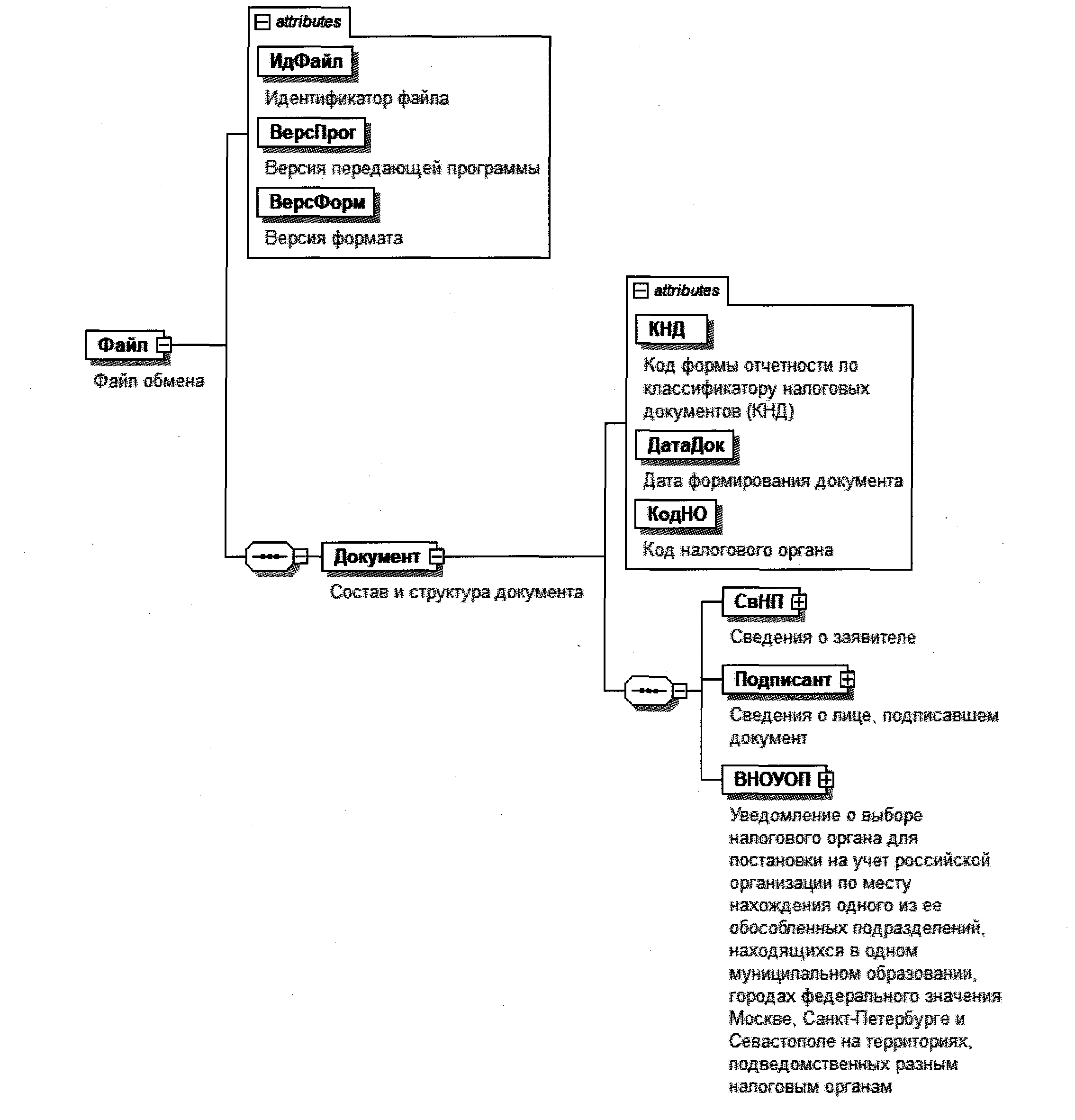 | Уведомление о выборе налогового органа для постановки на учет российской организации по месту нахождения одного из ее обособленных подразделений, находящихся в одном муниципальном образовании, городах федерального значения Москве, Санкт-Петербурге и Севастополе на территориях, подведомственных разным налоговым органам | ВНОУОП | С | О | Состав элемента представлен в таблице 4.7 |