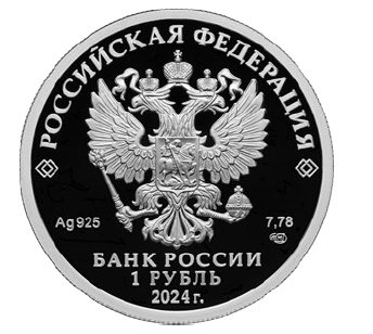 На лицевой стороне монет расположено рельефное изображение Государственного герба Российской Федерации, имеются надписи: “РОССИЙСКАЯ ФЕДЕРАЦИЯ”, “БАНК РОССИИ”, номинал монет “1 РУБЛЬ”, дата “2024 г.”, обозначение металла по Периодической системе элементов Д.И. Менделеева, проба сплава, товарный знак Санкт-Петербургского монетного двора и масса драгоценного металла в чистоте.