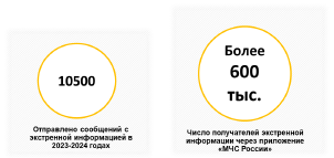 В 2023 - 2024 годах через мобильное приложение "МЧС России" направлено более 10,5 тысяч сообщений с экстренной информацией (рис. 3).
