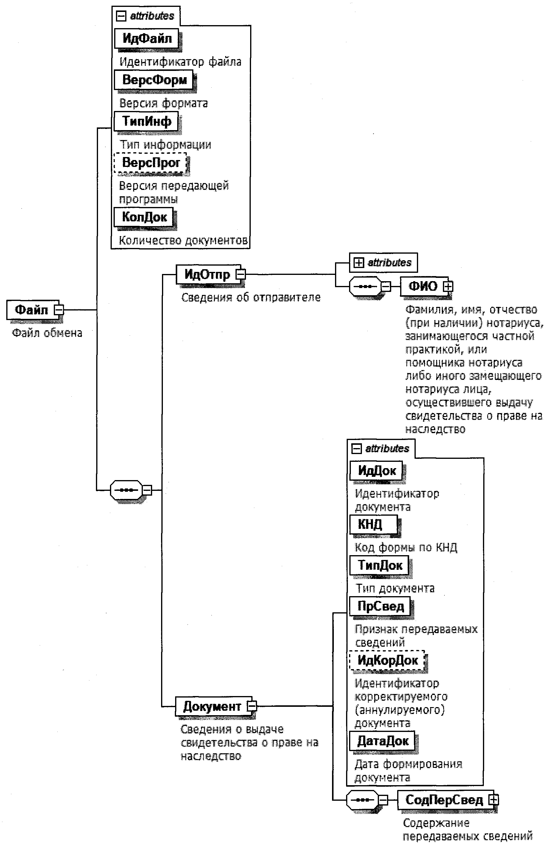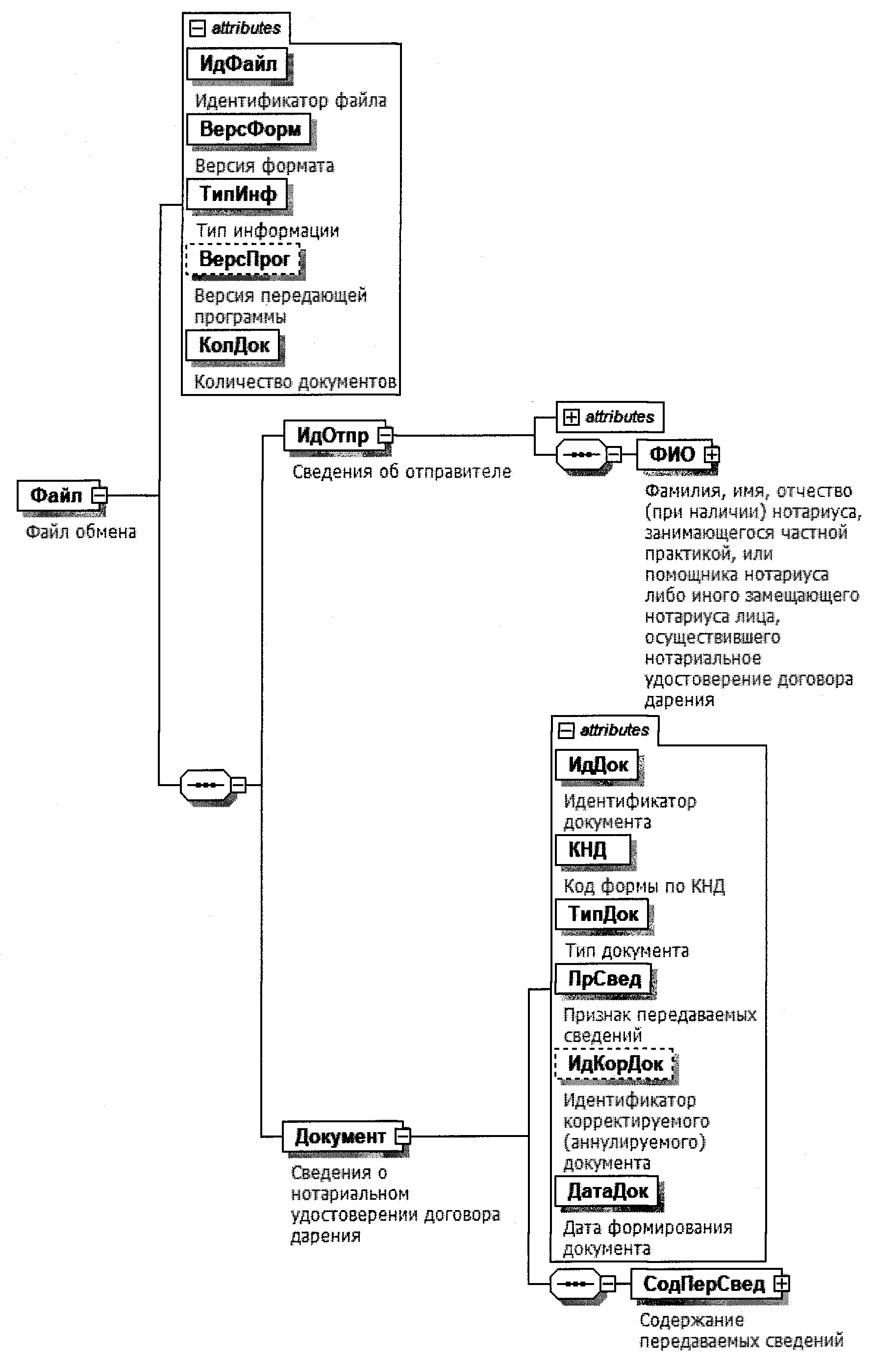 | Сведения о дарителе - физическом лице | | СвДарФизЛ | С | О | Типовой элемент <СвФЛДарТип>. Состав элемента представлен в таблице 4.18 | |