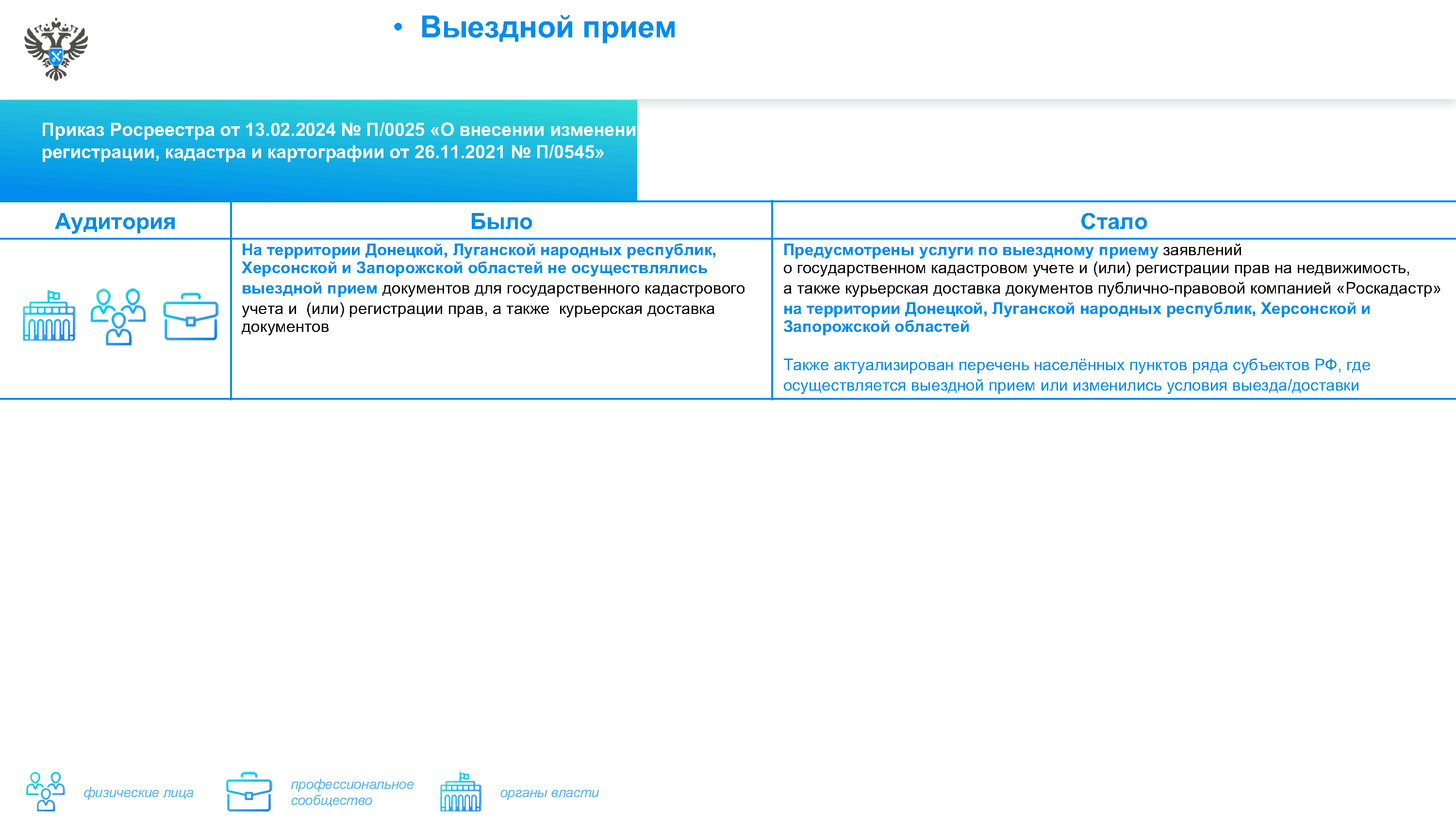 Приказом Росреестра N П/0025 (от 13 февраля 2024 г.) на территории Донецкой, Луганской народных республик, Херсонской и Запорожской областей предусмотрены услуги по выездному приему заявлений о государственном кадастровом учете и (или) регистрации прав на недвижимость. Также в новых субъектах стала доступна курьерская доставка документов публично-правовой компанией "Роскадастр". Ранее такие услуги не предоставлялись.