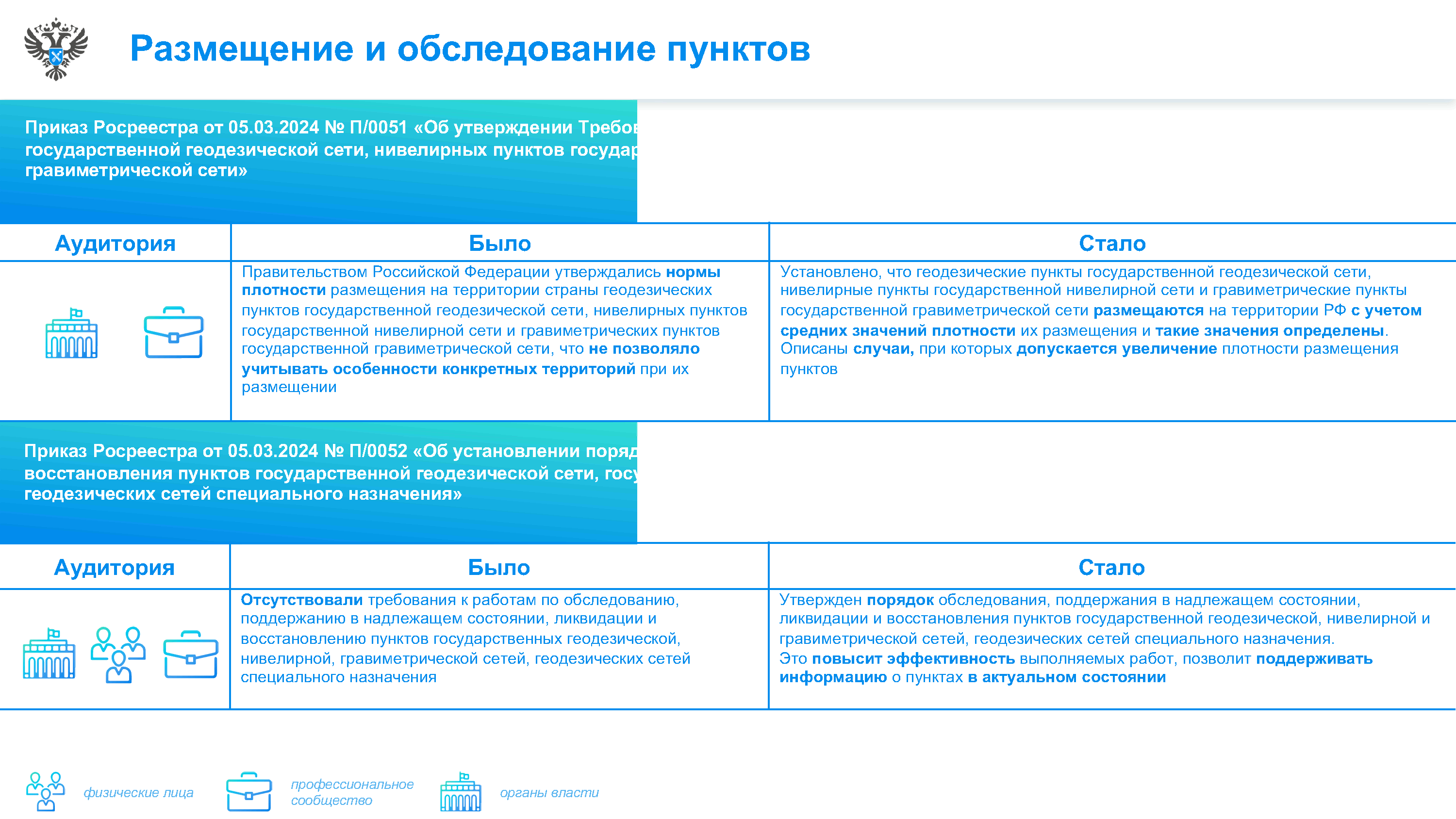 Приказом Росреестра N П/0052 (от 5 марта 2024 г.) утвержден порядок обследования, поддержания в надлежащем состоянии, ликвидации и восстановления пунктов государственной геодезической, нивелирной и гравиметрической сетей, а также геодезических сетей специального назначения. Ранее таких требований не было. Это повысит эффективность выполняемых работ, позволит поддерживать информацию о пунктах в актуальном состоянии.