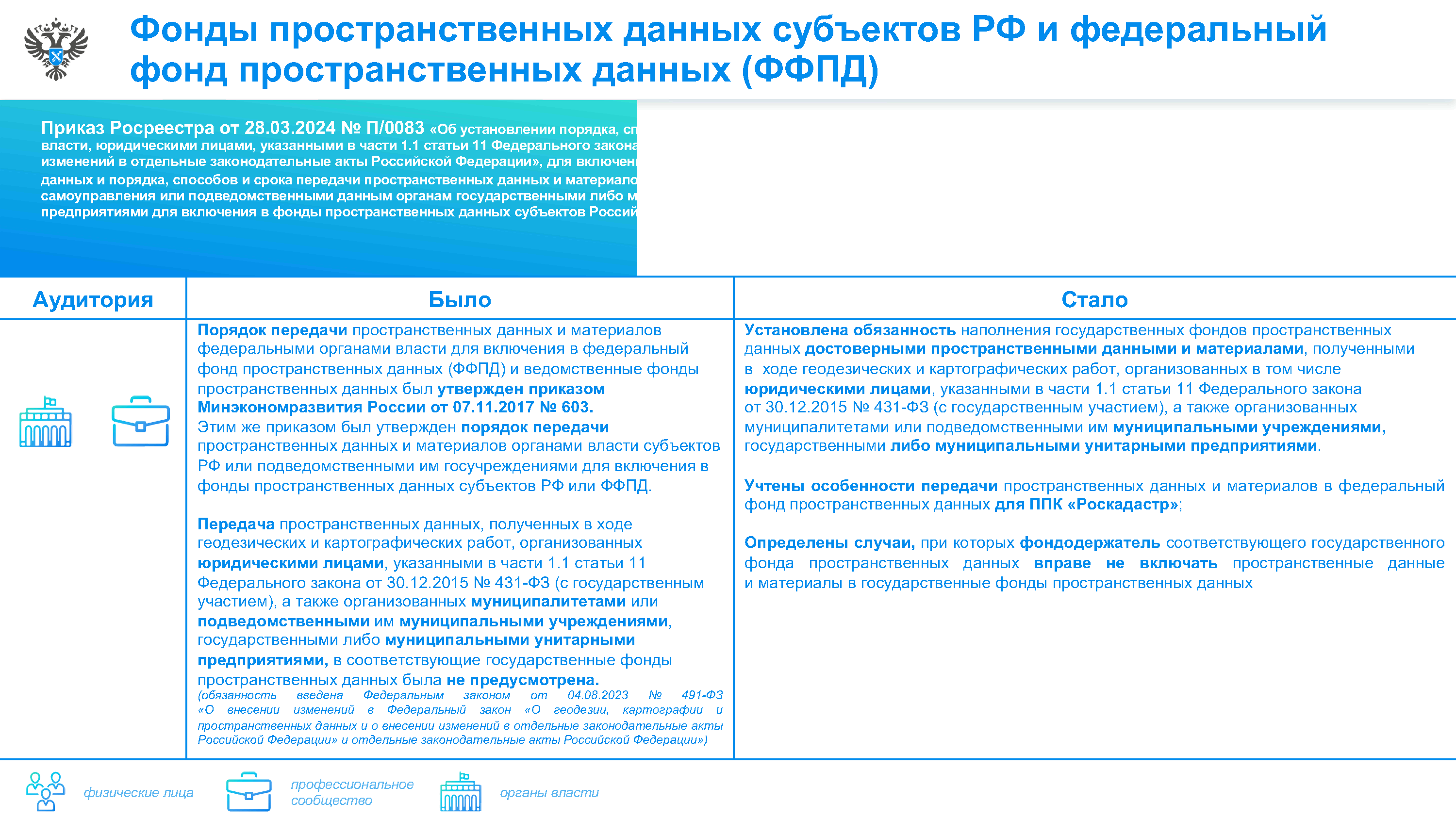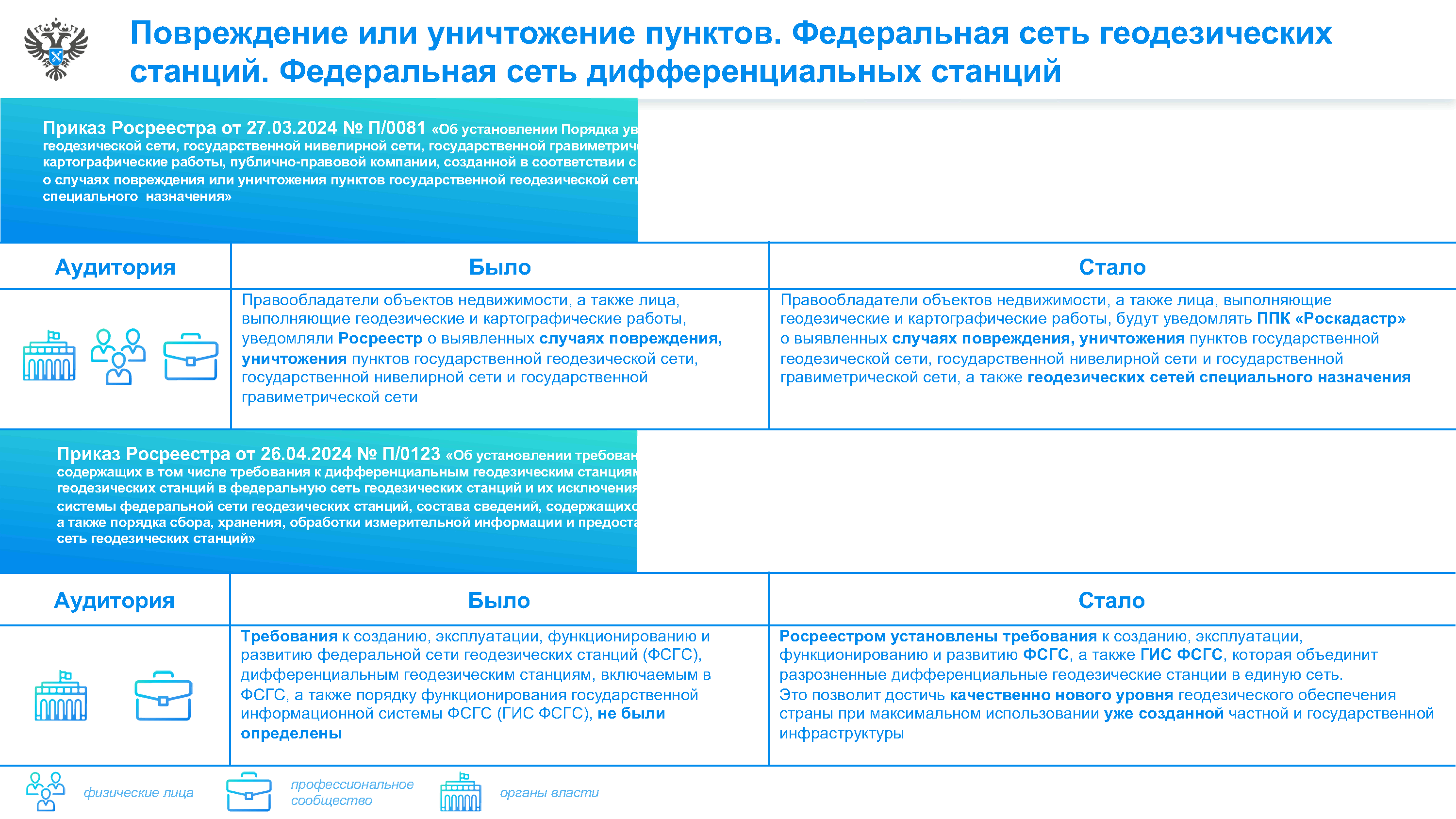 Приказом Росреестра N П/0123 (от 26 апреля 2024 г.) установлены требования к созданию, эксплуатации, функционированию и развитию федеральной сети геодезических станций (ФСГС), а также ГИС ФСГС, которая объединит разрозненные дифференциальные геодезические станции в единую сеть. Это позволит достичь качественно нового уровня геодезического обеспечения страны при максимальном использовании уже созданной частной и государственной инфраструктуры.