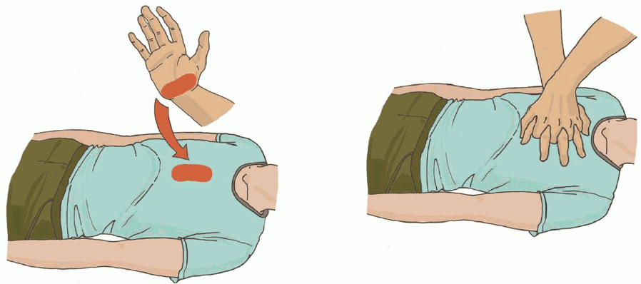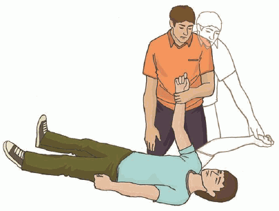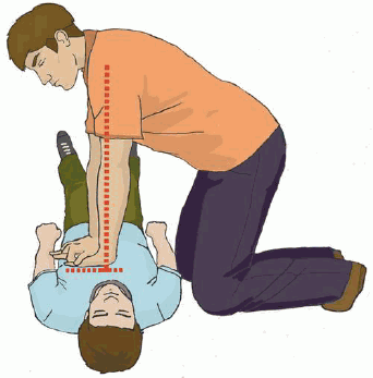 Чередовать 30 надавливаний на грудину с 2-мя вдохами искусственного дыхания.