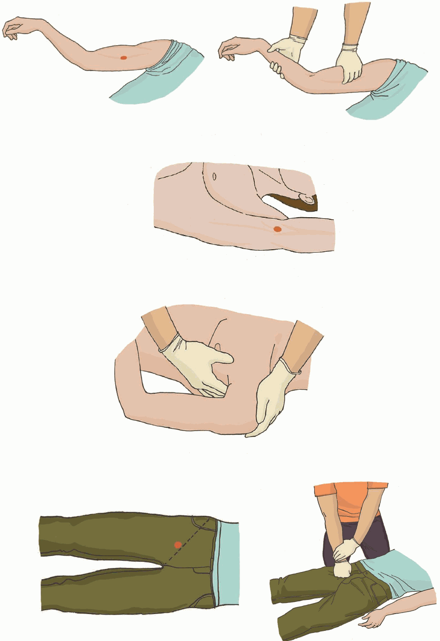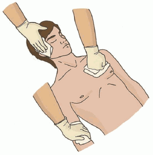 | 7. Проведите обзорный осмотр пострадавшего для обнаружения наружного кровотечения и остановите его (выполните прямое давление на рану, наложите давящую повязку). При невозможности или неэффективности этих действий осуществите пальцевое прижатие артерии и наложите кровоостанавливающий жгут; или выполните максимальное сгибание конечности в суставе. | |