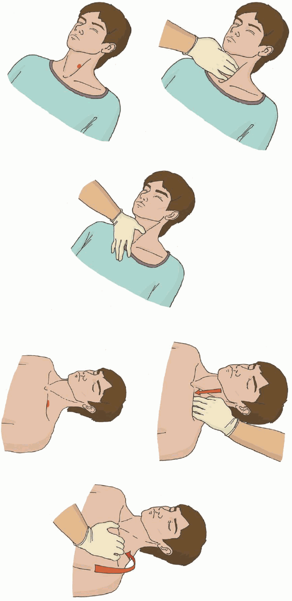 2) при травмах шеи - остановить кровотечение прямым давлением на рану, наложением давящей повязки или пальцевым прижатием артерии.