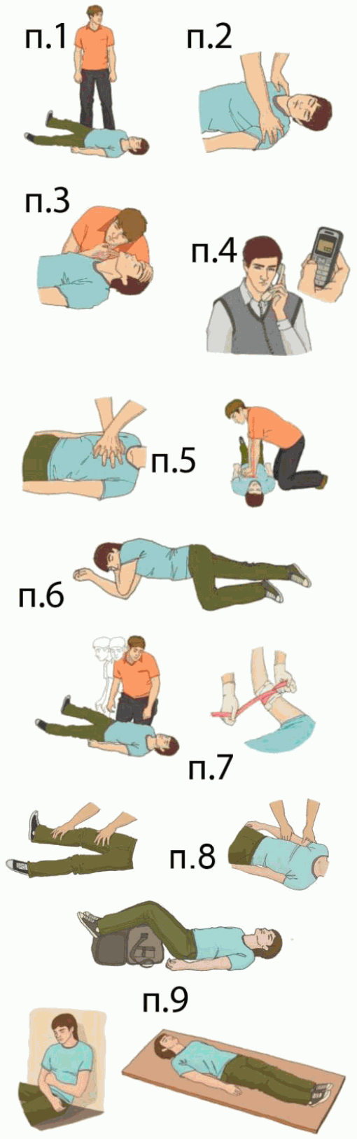| 10. Постоянно контролируйте состояние пострадавшего (наличие сознания, дыхания и кровообращения) и оказывайте психологическую поддержку. | |
