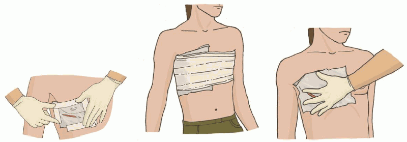 3) при травмах груди - остановить кровотечение прямым давлением на рану, наложить герметизирующую повязку;