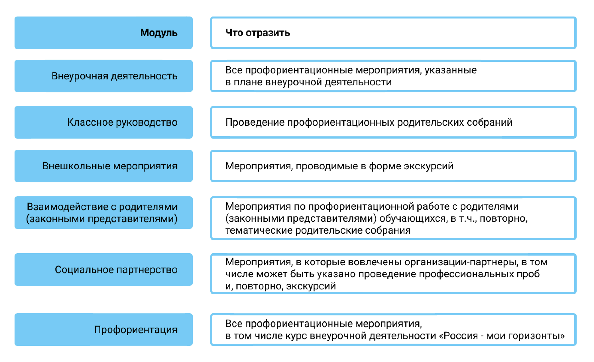 - мероприятия по профессиональной ориентации осуществляются организациями, осуществляющими образовательную деятельность по образовательным программам основного общего и среднего общего образования (далее - Организации), в видах и формах воспитательной деятельности по модулю "Профориентация", предусмотренных рабочими программами воспитания, разрабатываемыми в соответствии с федеральными основными общеобразовательными программами.