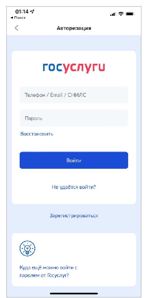 Авторизация (вход) в мобильном приложении "Госуслуги" осуществляется по логину и паролю.