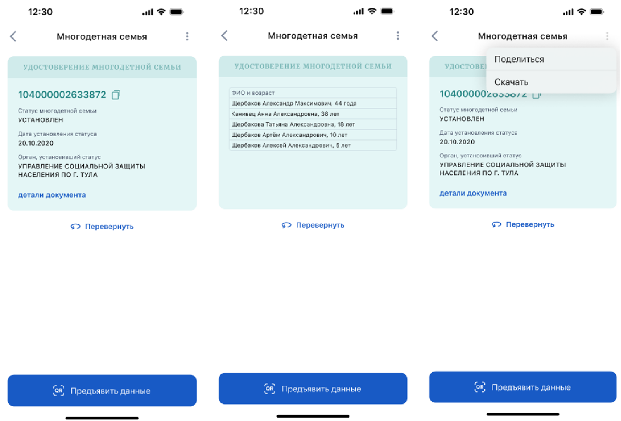 На экране отображается подробная информация о документе с возможностью перейти на детальный экран документа. Документ является двусторонним, по нажатию на кнопку переворота отображается вторая сторона документа с составом семьи. Пользователю доступны функциональности поделиться данными документа, скачать документ в формате .pdf или предъявить документ в виде QR-кода документа (Рисунок 2).