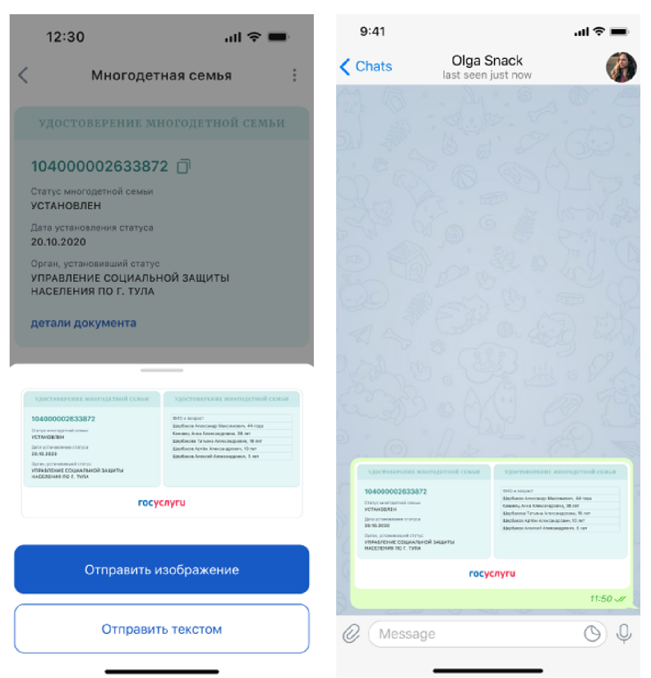 По нажатию на кнопку деталей документа открывается детальный экран с информацией о документе и составе семьи с функциональностью поделиться данными документа в виде текстового сообщения (Рисунок 3).