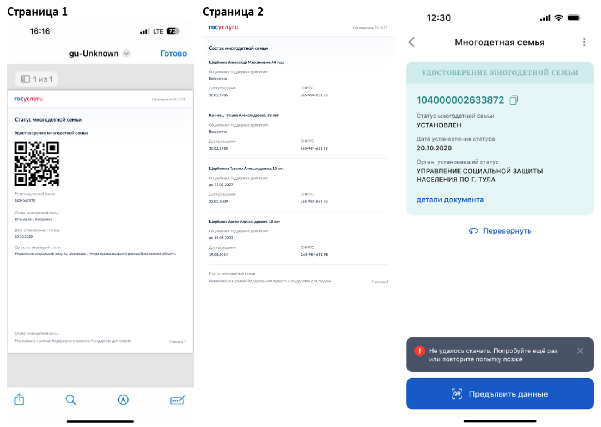 визуализацию в мобильном приложении "Госуслуги" сведений, подтверждающих отнесение гражданина и (или) членов его семьи к составу многодетной семьи, после считывания двухмерного штрихового кода (QR-кода) с использованием указанного мобильного приложения;