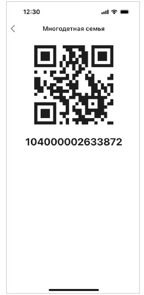 При нажатии на кнопку "Предъявить данные" на экране документа открывается экран с QR-кодом документа (Рисунок 6), при сканировании которого открывается детальный экран удостоверения многодетной семьи во внутреннем браузере приложения.