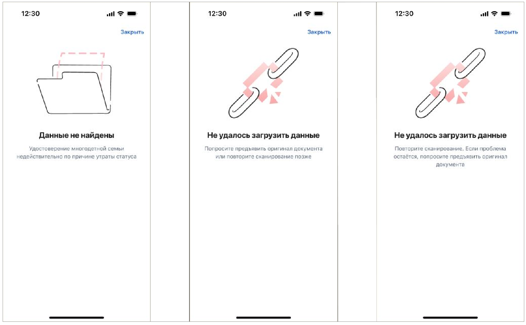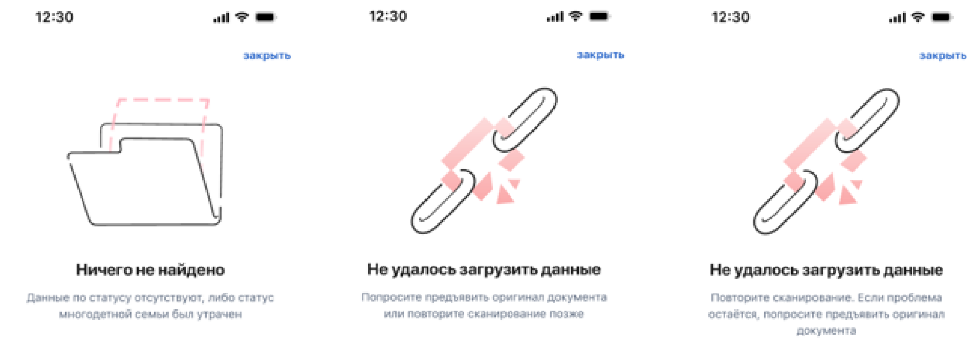 Рисунок 7 - Макеты экранов ошибок сканирования Удостоверения многодетной семьи