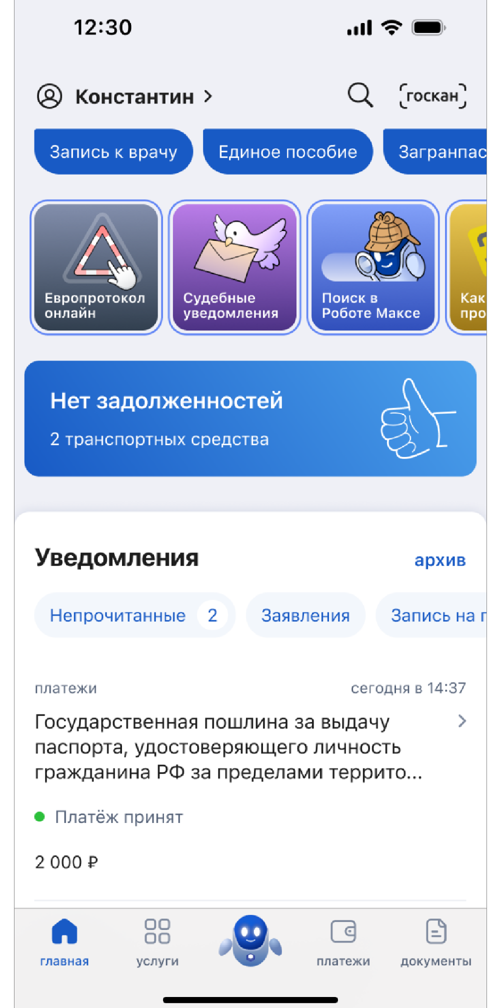Кнопка для сканирования QR-кодов находится на главном экране в правом верхнем углу - кнопка "Госкан" (Рисунок 8);