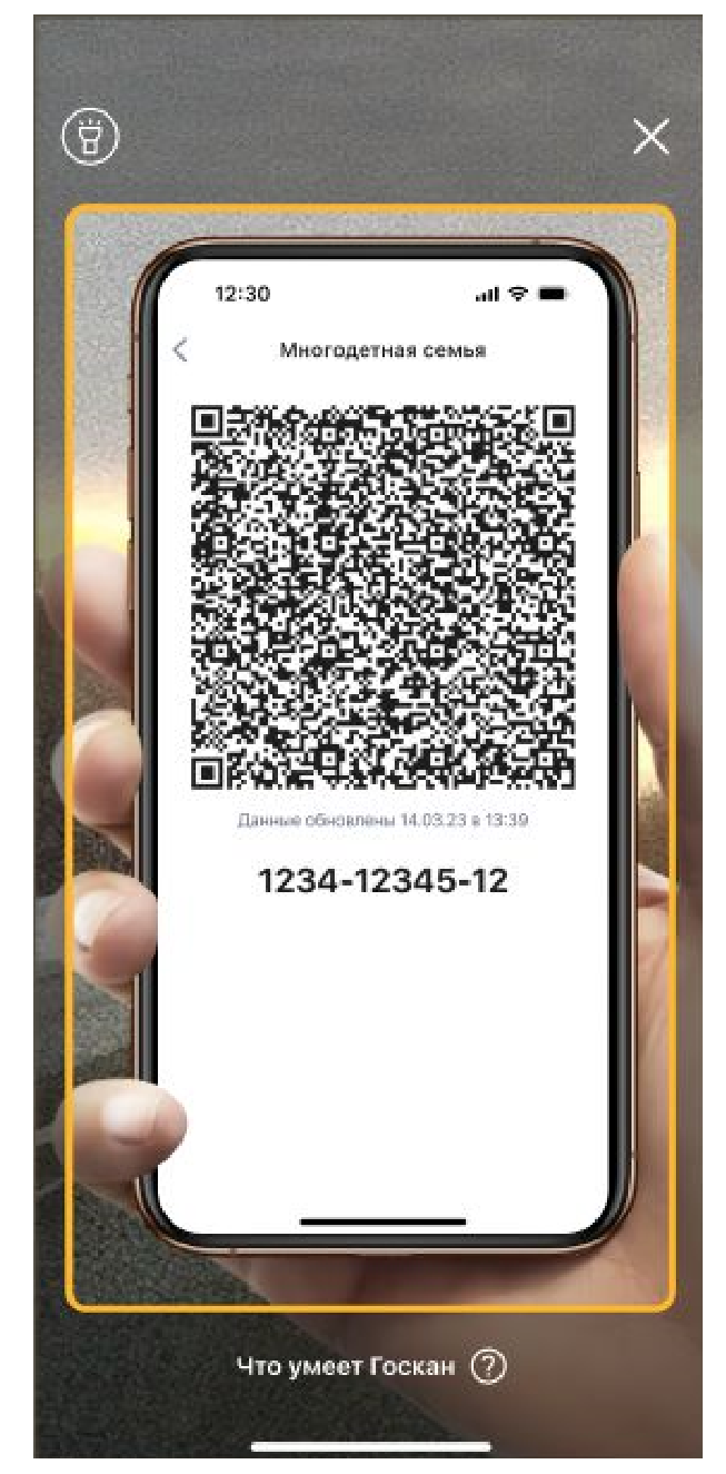 4. В случае сканирования удостоверения с экрана смартфона гражданина проверяющему необходимо навести камеру устройства на QR-код электронного удостоверения многодетной семьи, отображаемый на экране смартфона гражданина.