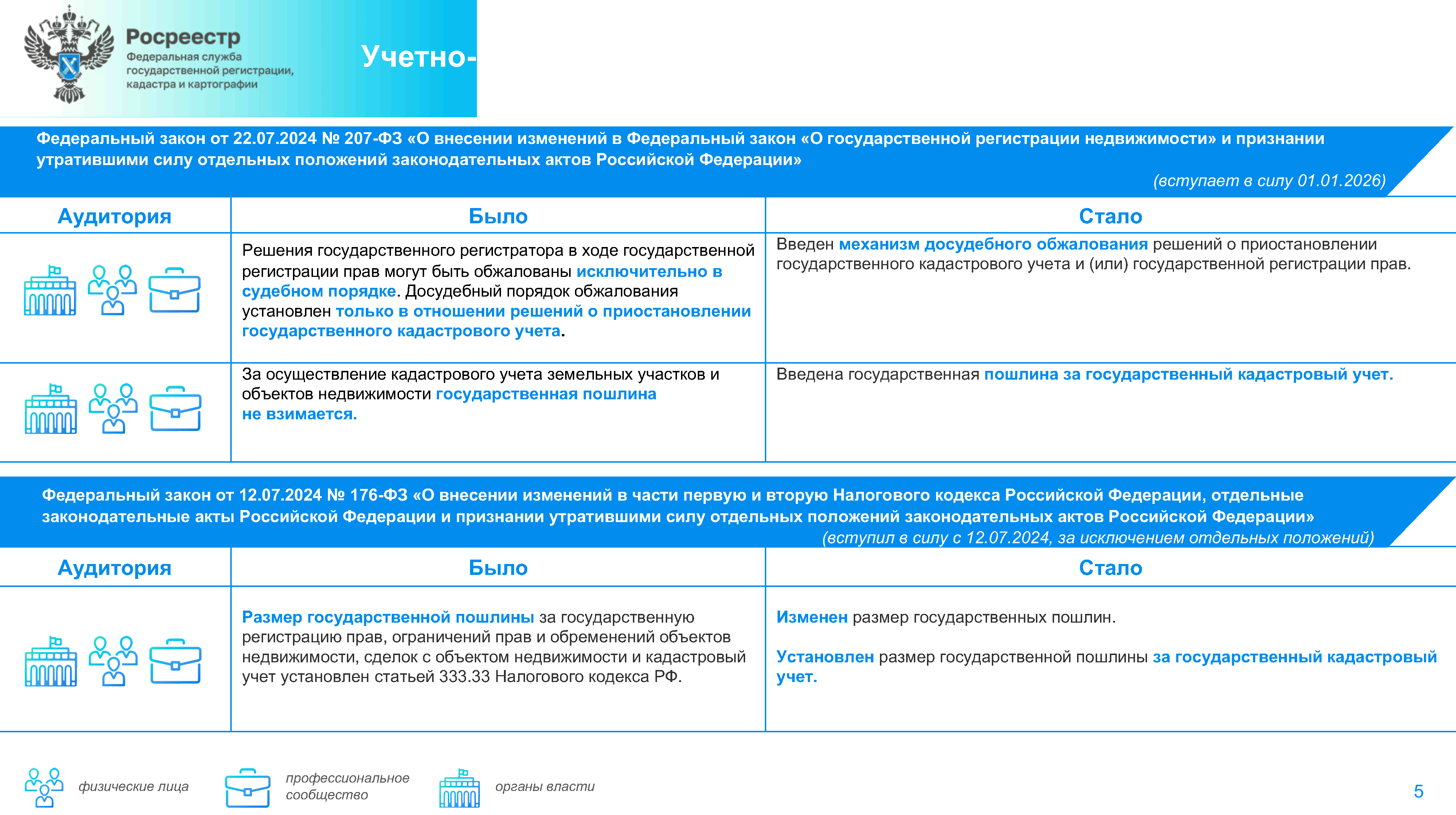 В рамках исполнения рекомендаций Счетной палаты принят Федеральный закон N 207-ФЗ (от 22 июля 2024 г.), которым установлена возможность внесудебного обжалования решений о приостановлении государственной регистрации прав на недвижимое имущество. Ранее в досудебном порядке можно было обжаловать только решения о приостановлении государственного кадастрового учета. Закон позволит урегулировать часть спорных решений в досудебном порядке, поможет гражданам решить вопросы в короткие сроки, а также снизит нагрузку на судебную систему.