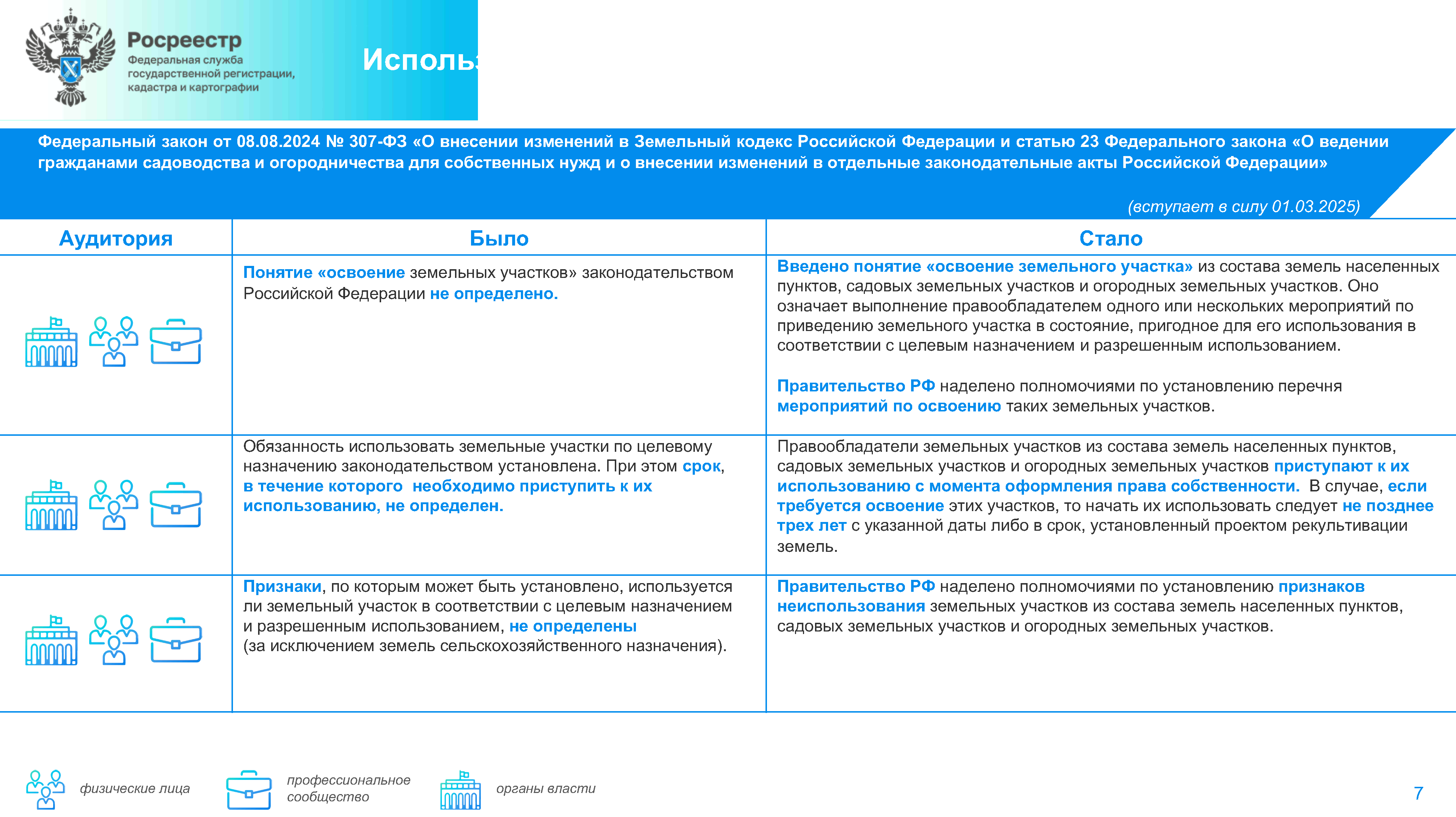 Также принят Федеральный закон N 307-ФЗ (от 8 августа 2024 г.), которым определяется срок для освоения земельных участков в границах населенных пунктов, а также садовых и огородных участков. Законом обеспечена защита правообладателей, которые по объективным причинам не могут начать использование участка сразу после оформления прав. Прежде всего это касается проблемных участков, которые заболочены, захламлены или заросли сорной растительностью. Человеку даётся 3 года, чтобы провести все необходимые работы и подготовить участок к использованию (очистить его от мусора, осушить, выровнять рельеф и т.д.). После истечения 3 лет собственник начинает ее использовать по назначению.