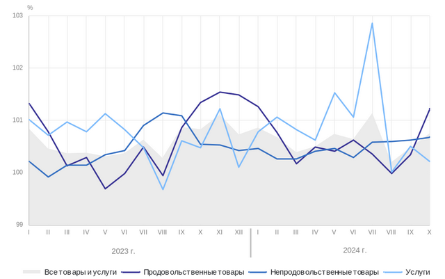 | непродовольственные товары | 100,68 | 104,74 | 105,74 | 106,47 | 100,55 | 104,96 | 105,08 | 103,83 |