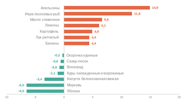В октябре изменились цены на отдельные виды плодоовощной продукции: на апельсины +14,9%, лимоны +6,1%, картофель +4,9%, лук репчатый и бананы +4,4%, огурцы +3,8%, чеснок +3,6%, помидоры +3,2%, зелень свежую +2,6%, ягоды замороженные +2,4%. Снизились цены: на яблоки и морковь (-6,5%), капусту белокочанную (-3,4%).