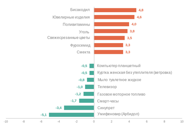 В октябре цены на лекарственные препараты, относящиеся к жизненно необходимым и важнейшим лекарственным препаратам (ЖНВЛП), в среднем изменились на +1,1%, в том числе на бисакодил +4,8%, фуросемид и смекту +3,3%, перекись водорода +3,0%, парацетамол +2,0%, дротаверин (но-шпу) +1,6%, эуфилин +1,5%, аскорбиновую кислоту, амоксициллин с клавулановой кислотой и гриппферон +1,2%. Снизились цены на умифеновир (арбидол) (-5,1%).