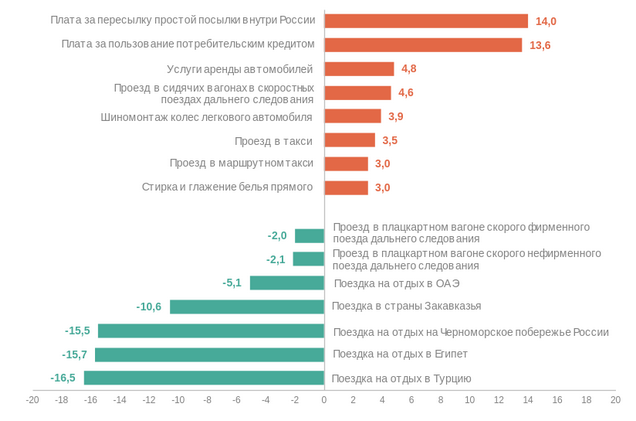 Среди услуг зарубежного туризма снизились цены: на поездки на отдых в Турцию (-16,5%), Египет (-15,7%), страны Закавказья (-10,6%), ОАЭ (-5,1%), отдельные страны Юго-Восточной (-1,4%) и Средней (-0,7%) Азии. Изменились цены на поездки в Беларусь +1,2%.