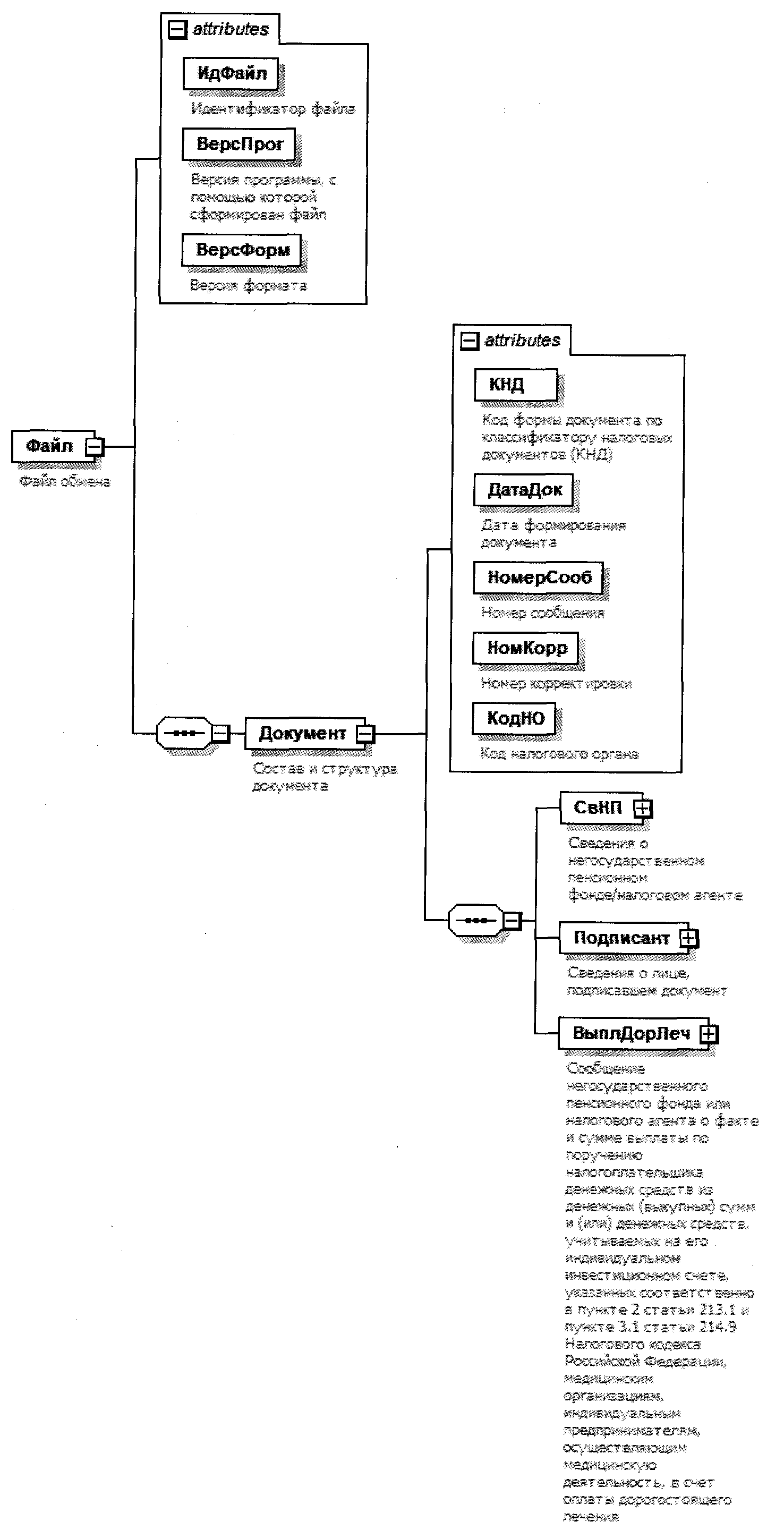 4. Логическая модель файла обмена представлена в виде диаграммы структуры файла обмена на рисунке 1 настоящего формата. Элементами логической модели файла обмена являются элементы и атрибуты XML-файла. Перечень структурных элементов логической модели файла обмена и сведения о них приведены в таблицах 4.1 - 4.12 настоящего формата.