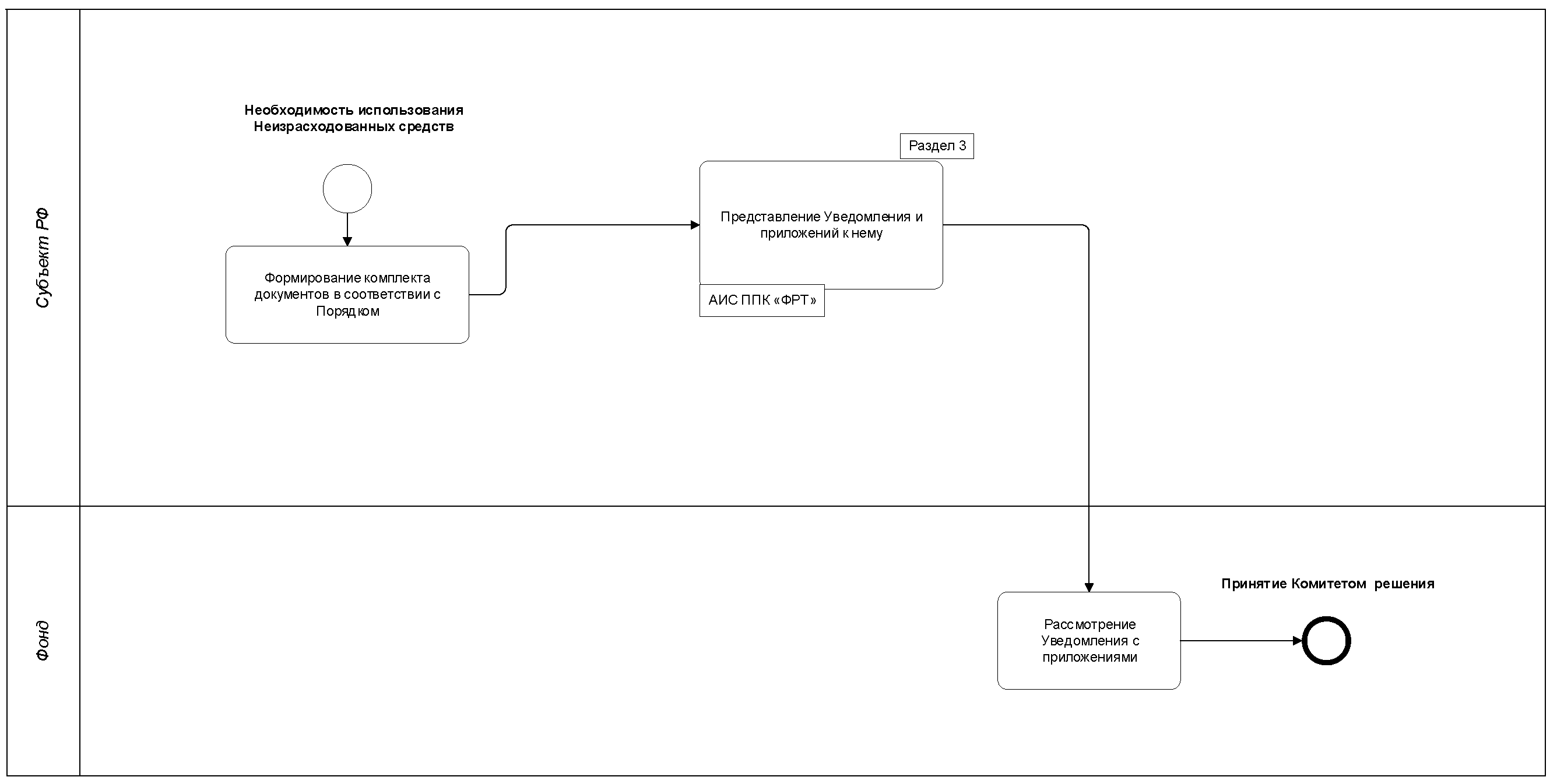 1.5. Точкой выхода процесса является рассмотрение и принятие решения о согласовании (несогласовании) Комитетом по рассмотрению вопросов, связанных с созданием безопасных и благоприятных условий проживания граждан (далее - Комитет Фонда), возможности использования субъектом Российской Федерации Неизрасходованных средств на основании представленного субъектом Российской Федерации уведомления о внесении изменений в заявку на предоставление финансовой поддержки за счет средств Фонда на переселение граждан из аварийного жилищного фонда (далее - Уведомление, Заявка соответственно), рассмотрение и принятие решения о согласовании Комитетом Фонда отказа субъекта Российской Федерации от части лимита предоставления финансовой поддержки.