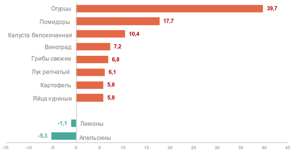 В декабре изменились цены на отдельные виды плодоовощной продукции: на огурцы +39,7%, помидоры +17,7%, капусту белокочанную +10,4%, виноград +7,2%, грибы свежие +6,8%, лук репчатый +6,1%, картофель +5,8%, зелень свежую +5,7%, груши +5,3%, яблоки +4,9%, чеснок +4,8%, бананы +4,4%, морковь +2,9%, свеклу столовую +2,8%. Снизились цены на апельсины (-5,3%) и лимоны (-1,1%).