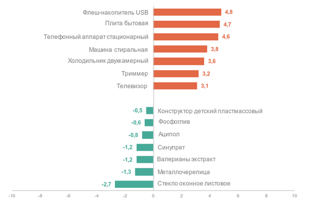 В декабре среди телерадиотоваров, средств связи, электротоваров и других бытовых приборов изменились цены: на флеш-накопители USB +4,8%, плиты бытовые +4,7%, телефонные аппараты стационарные +4,6%, машины стиральные +3,8%, холодильники +3,6%, триммеры +3,2%, телевизоры +3,1%, дрели электрические +2,9%, миксеры, блендеры +2,8%, электропылесосы +2,7%, электрочайники +2,3%, смартфоны +2,0%, машины швейные +1,8%, печи микроволновые +1,7%.
