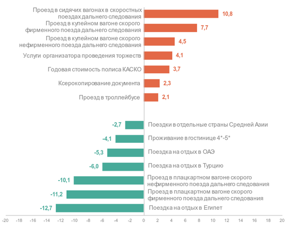 Среди услуг зарубежного туризма изменились цены: на поездки на отдых в страны Закавказья +1,2% и Беларусь +0,2%. Снизились цены: на поездки на отдых в Египет (-12,7%), Турцию (-6,0%), ОАЭ (-5,3%), отдельные страны Средней (-2,7%) и Юго-Восточной (-2,3%) Азии.