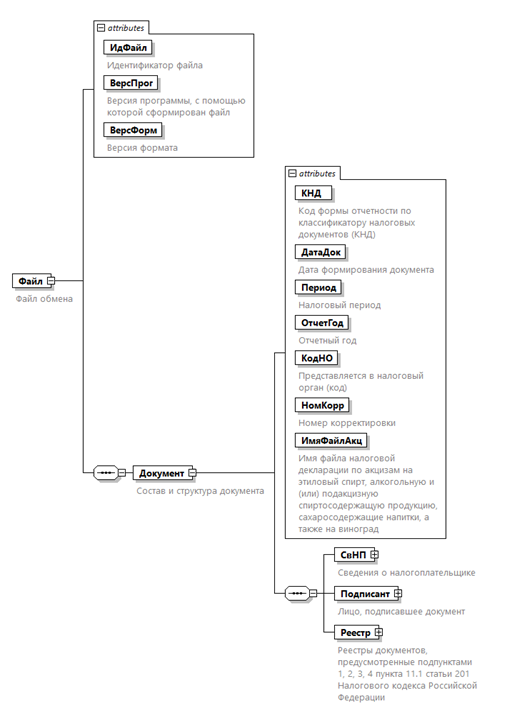 | Реестр документов, подтверждающих оприходование фармацевтической субстанции спирта этилового налогоплательщиком, в случае оприходования фармацевтической субстанции спирта этилового, произведенного в структуре организации, имеющей свидетельство на производство фармацевтической продукции (подпункт 2 пункта 11.1 статьи 201 Налогового кодекса Российской Федерации) | ДокОпр201 | С | НМУ | Состав элемента представлен в таблице 4.11. Элемент является обязательным при <СумНалНач> > 0 и при отсутствии элемента <СвСчФ> | |