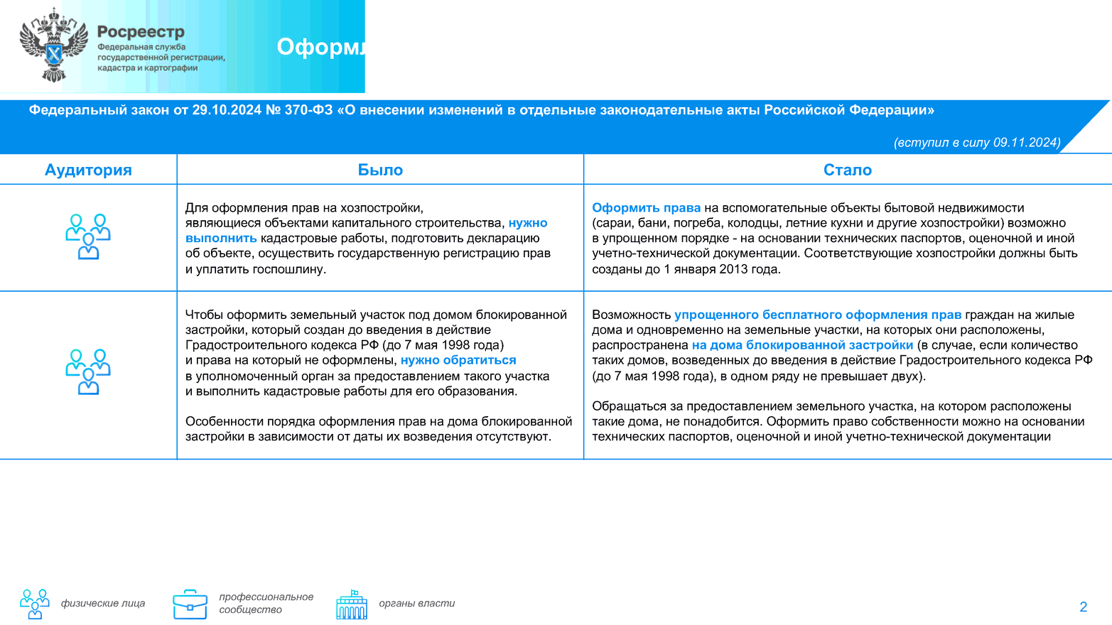 В интересах дачников и садоводов принят Федеральный закон N 370-ФЗ (от 29 октября 2024 г.), который направлен на упрощение оформления прав граждан на вспомогательные объекты бытовой недвижимости, созданные до 1 января 2013 года. Это сараи, бани, погреба, летние кухни, колодцы, навесы и другие хозпостройки. Теперь такие постройки можно оформить на основании старых документов технической инвентаризации. Например, это может быть технический паспорт домовладения, ранее выданный БТИ.