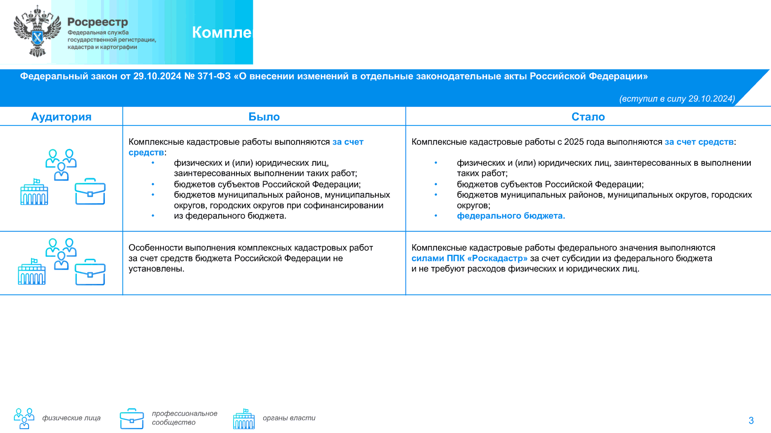 В целях повышения качества проведения комплексных кадастровых работ (ККР) принят Федеральный закон N 371-ФЗ (от 29 октября 2024 г.). Он призван решить существующие проблемы, связанные с нарушением сроков проведения ККР и низким качеством подготовки документов по контрактам со стороны исполнителей - кадастровых инженеров. Выполнение ККР федерального значения возложено на ППК "Роскадастр". Закон позволит под ключ решить для людей вопросы по уточнению границ земельных участков и исправлению исторически накопленных реестровых ошибок в сведениях о границах объектов.