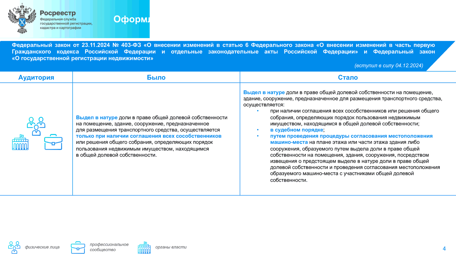 В интересах автолюбителей принят Федеральный закон N 403-ФЗ (от 23 ноября 2024 г.). В нем прописан порядок выдела доли для образования машино-места, что расширит возможности граждан на реализацию этого права и упростит саму процедуру.