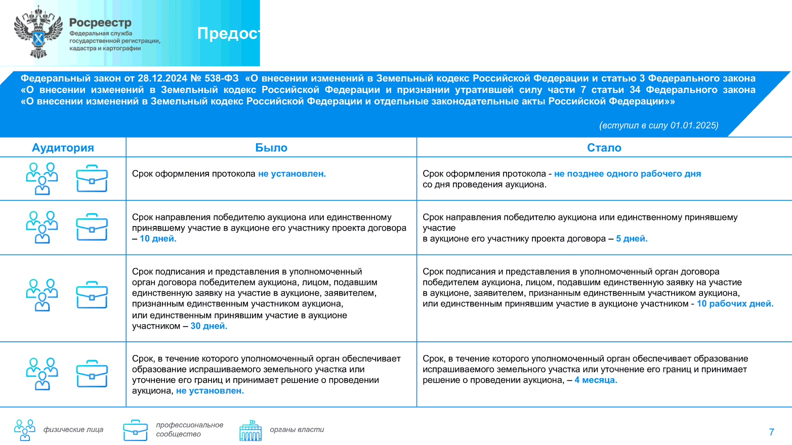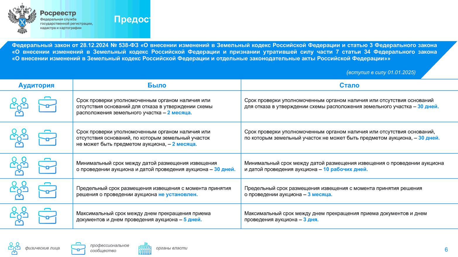 Также принят Федеральный закон N 538-ФЗ (от 28 декабря 2024 г.), направленный на сокращение сроков предоставления на торгах земельных участков, находящихся в государственной или муниципальной собственности. Законом скорректирован существующий порядок проведения аукциона по продаже или аренде земельных участков. Принятые меры позволят быстрее вовлекать земельные участки в хозяйственную деятельность, а также в целом сократить инвестиционно-строительный цикл.