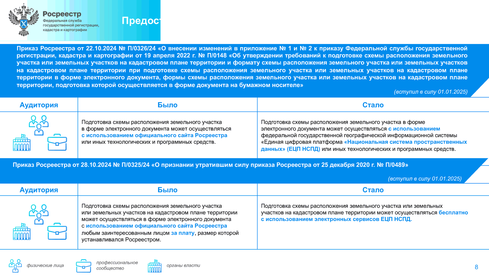 В целях оптимизации предоставления государственных услуг Росреестра принят приказ Росреестра N П/0326/24 (от 22 октября 2024 г.). Согласно документу, подготовка схемы расположения земельного участка в форме электронного документа может осуществляться с использованием Единой цифровой платформы "Национальная система пространственных данных" или иных технологических и программных средств. Ранее услуга была доступна только на официальном сайте Росреестра.