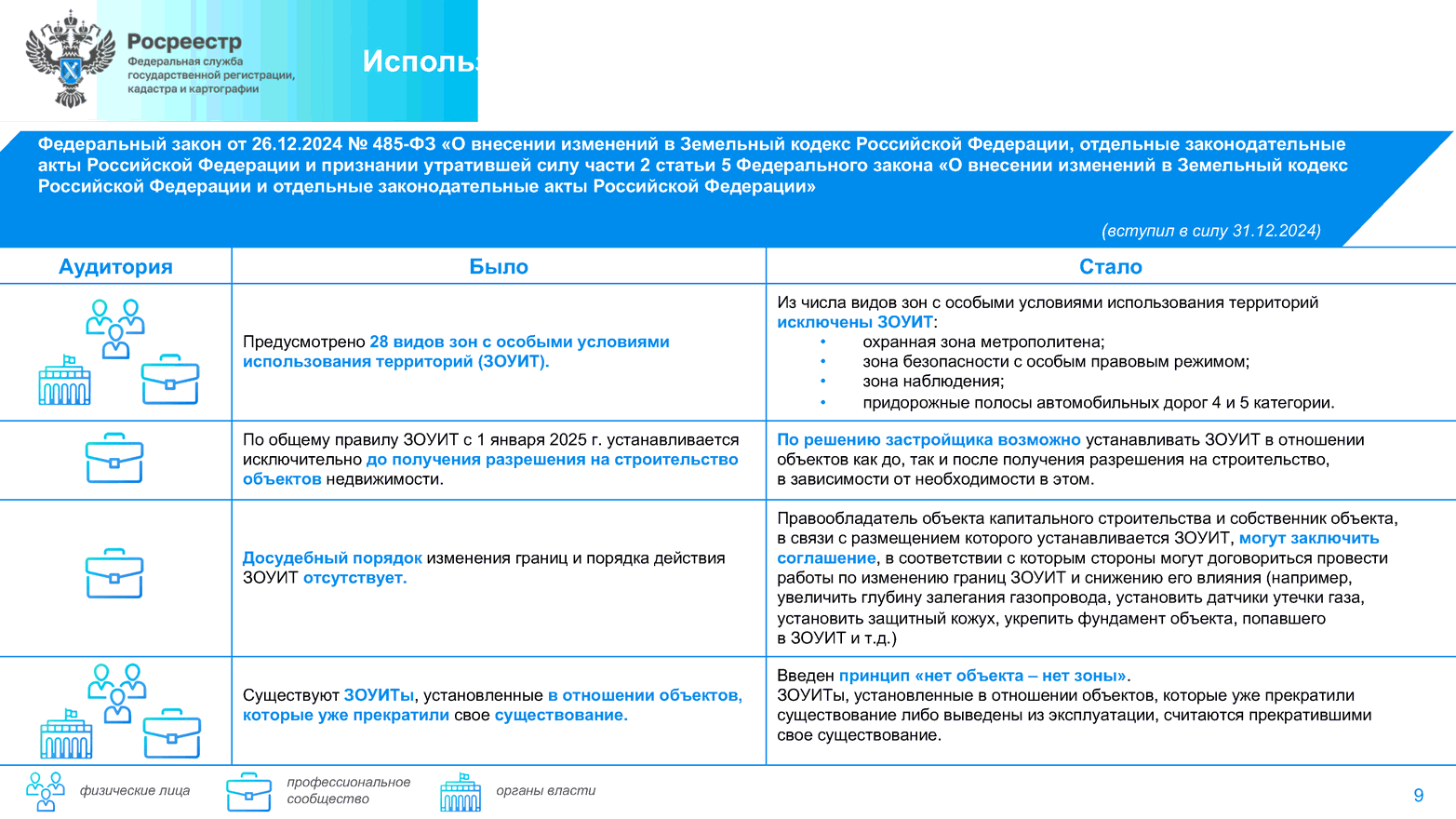Федеральным законом N 485-ФЗ (от 26 декабря 2024 г.) предусмотрен комплекс мер по совершенствованию правового регулирования зон с особыми условиями использования территорий (ЗОУИТ). Смягчение регулирования связано с тем, что действующие ЗОУИТ были установлены еще в советское время по правилам, которые не учитывают реальную градостроительную ситуацию и накладывают существенные ограничения как в отношении существующей недвижимости, так и в отношении свободных земель, которые могут быть вовлечены в оборот.