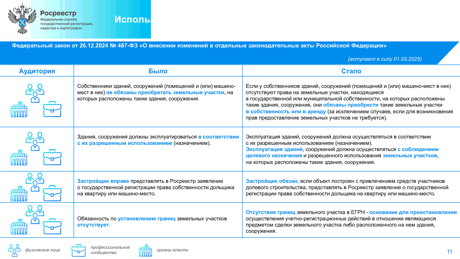 Федеральным законом N 487-ФЗ (от 26 декабря 2024 г.) предусмотрены механизмы, стимулирующие оформление земельных участков, зданий и сооружений гражданами и юридическими лицами. Вводится принцип "построил - оформи", в соответствии с которым эксплуатировать построенные здания и сооружения можно будет только после их оформления. Также в законе предусмотрено правило, по которому регистрация прав или сделок будет возможна только в отношении земельных участков с точными границами.