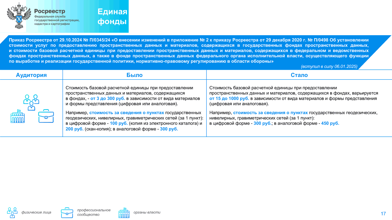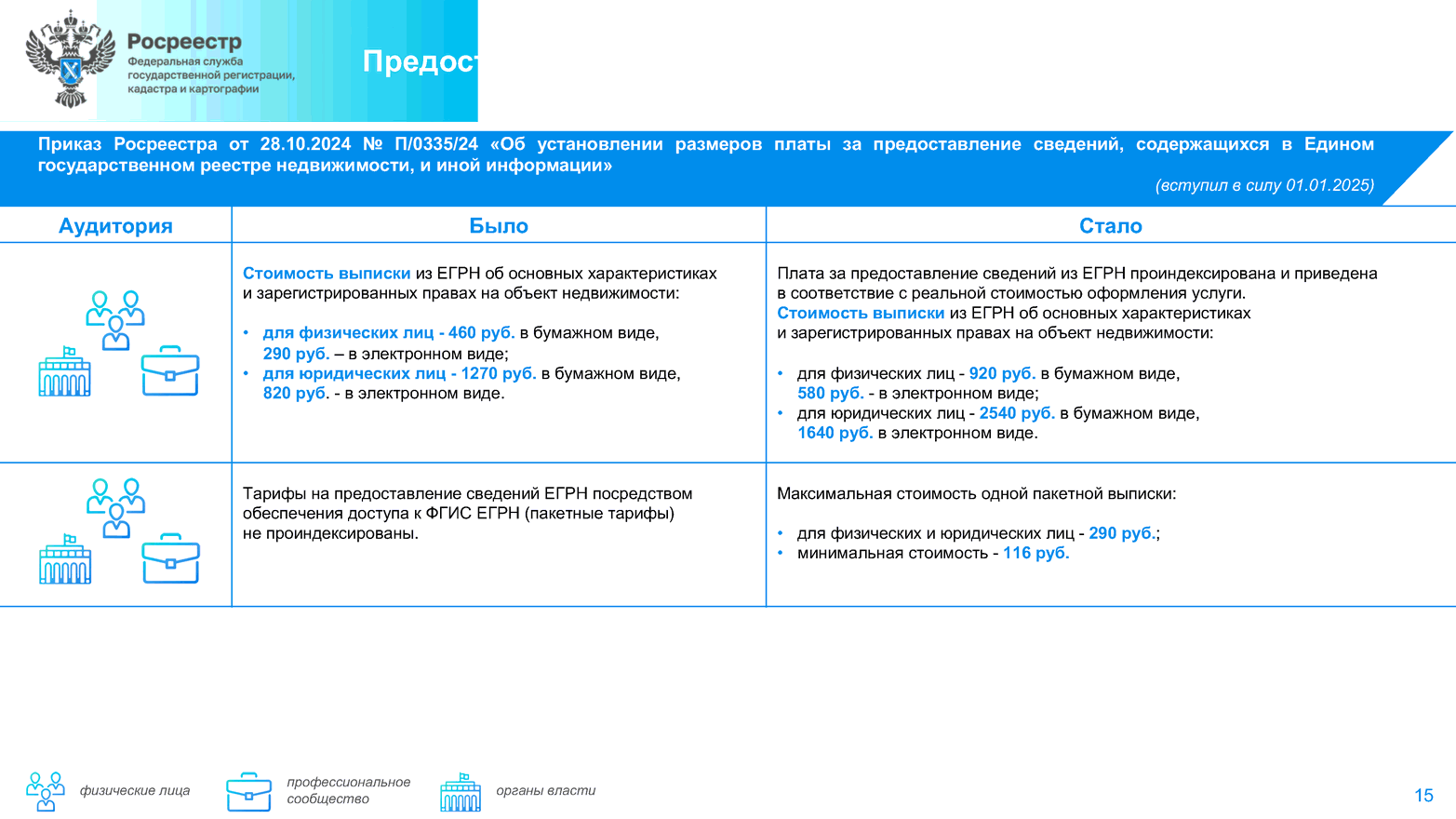 Приказом Росреестра N П/0335/24 (от 28 октября 2024 года) скорректированы размеры платы за предоставление сведений из ЕГРН.