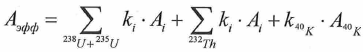 в которой суммирование ведется по всем гамма-излучающим радионуклидам природных рядов 238U и 235U (первое слагаемое), 232Th (второе слагаемое) и 40K (третье слагаемое), а коэффициенты ki учитывают относительный вклад гамма-излучения каждого из природных радионуклидов во внешнее гамма-излучение материала с данным содержанием природных радионуклидов. В условиях радиоактивного равновесия в рядах 238U и 232Th значение Аэфф рассчитывается по формуле (1).
