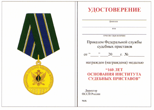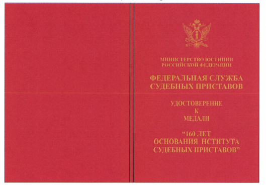 удостоверения к медали Федеральной службы судебных приставов "160 лет основания института судебных приставов"
