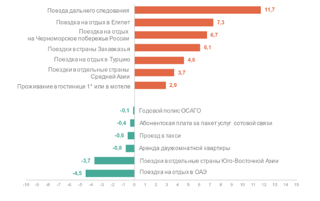 Среди услуг зарубежного туризма изменились цены: на поездки на отдых в Египет +7,3%, страны Закавказья +6,1%, Турцию +4,6%, отдельные страны Средней Азии +3,7%, Беларусь +2,2%. Снизились цены на поездки в ОАЭ (-4,5%) и отдельные страны Юго-Восточной Азии (-3,7%).